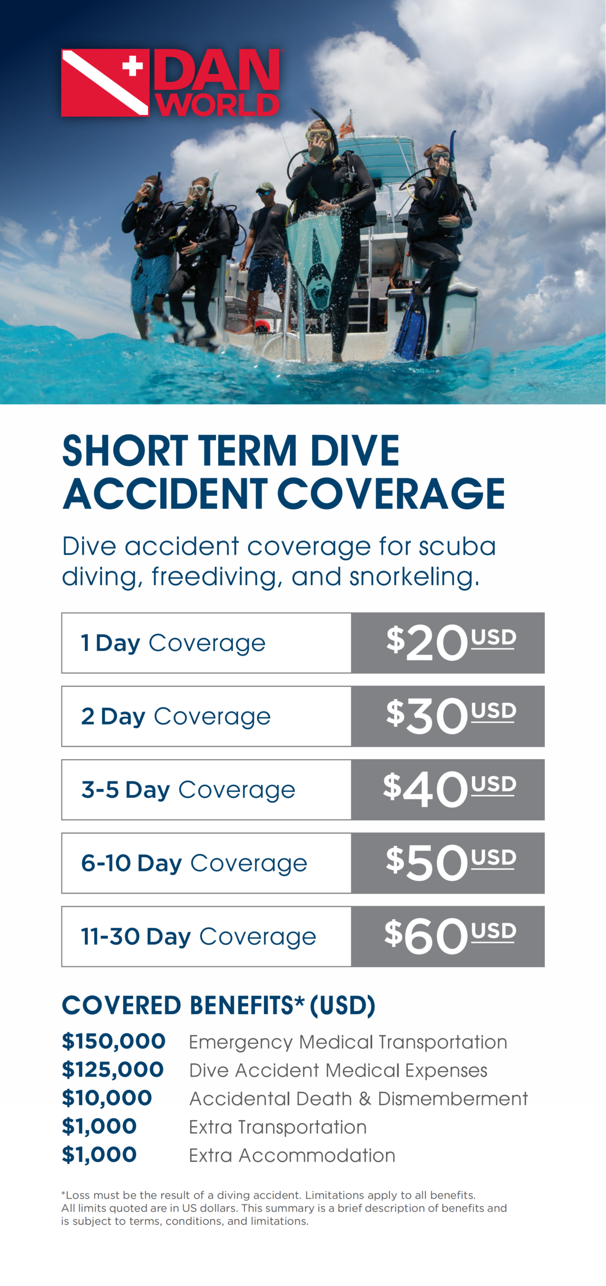 DAN World’s short-term daily dive accident insurance is designed specifically for holiday divers and short dive trips, providing flexible and affordable protection when you need it most. This coverage includes up to US$125,000 in dive accident medical expenses in the event of a dive-related accident, helping to cover the costs of treatment, hyperbaric chamber care, and emergency medical support. Whether you are diving for a single day or over several days, this short-term coverage helps safeguard you throughout your trip.